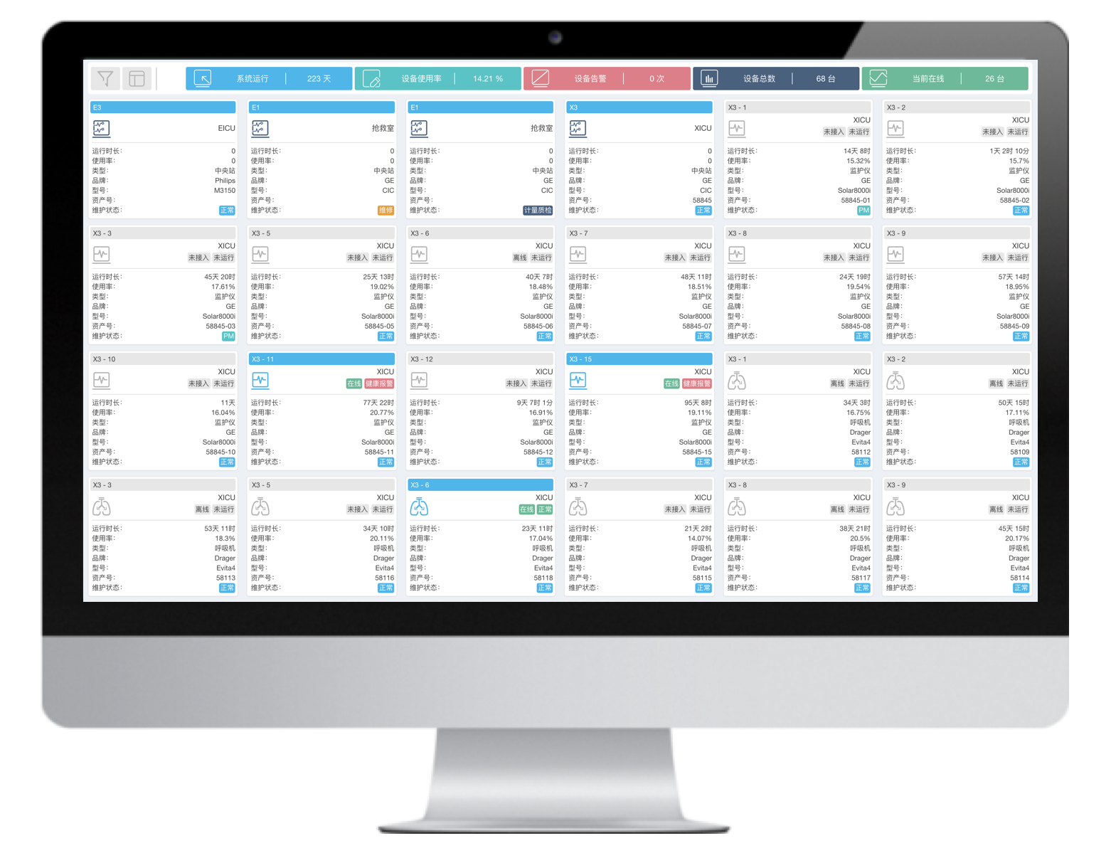 實時顯示數據引擎狀態,數據趨勢、設備使用概況、科室品牌設分布和使用概況、設備運維狀態、最新運行事件的可視化數據大屏